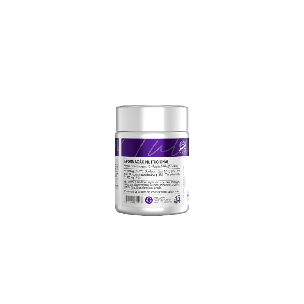 Formulado com Resveratrol (trans-resveratrol) e óleo de triglicérides de cadeia média (TCM), garantindo melhor absorção e eficácia. A cápsula contém gelatina, água purificada, glicerina e corantes naturais (cenoura roxa e óxido de ferro preto). Não contém glúten, ideal para pessoas com restrições alimentares.